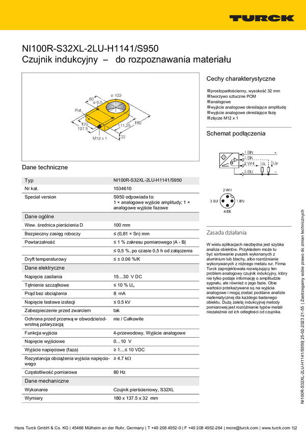 Turck Czujnik indukcyjny NI100R-S32XL-2LU-H1141/S950