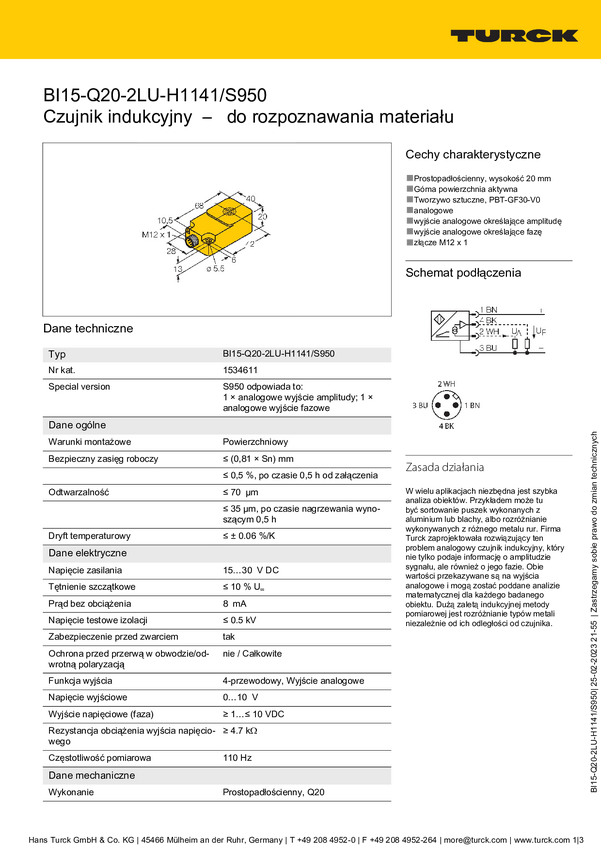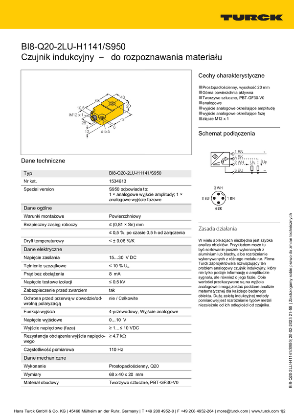 Turck Czujnik indukcyjny podtynkowy BI15-Q20-2LU-H1141/S950