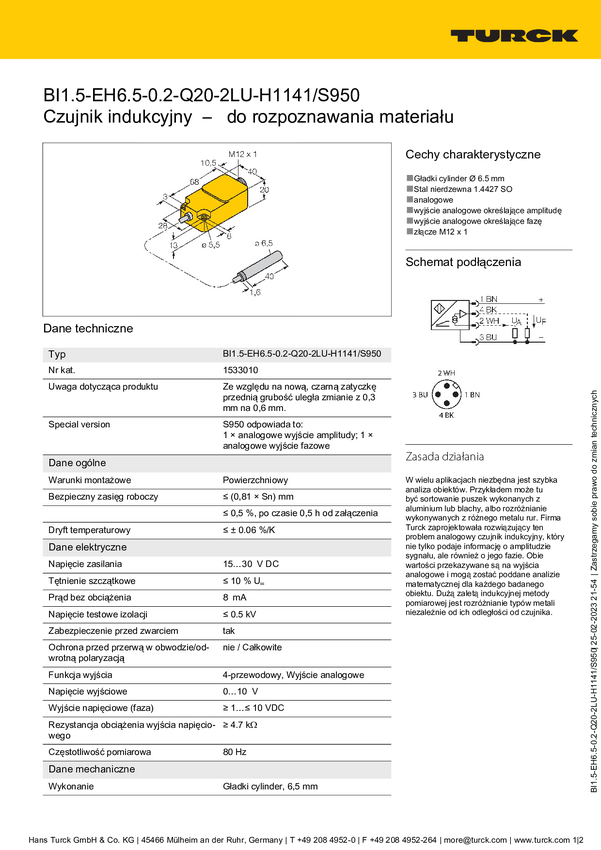 Czujnik indukcyjny Turck BI1,5-EH6,5-0,2-Q20-2LU-H1141/S950, 15 - 30 V, IP67, 1 szt.