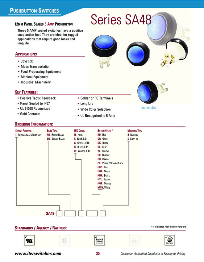 Switch Push Button SPDT Round Curved Button 5A 250VAC 28VDC Momentary Contact Solder Panel Mount