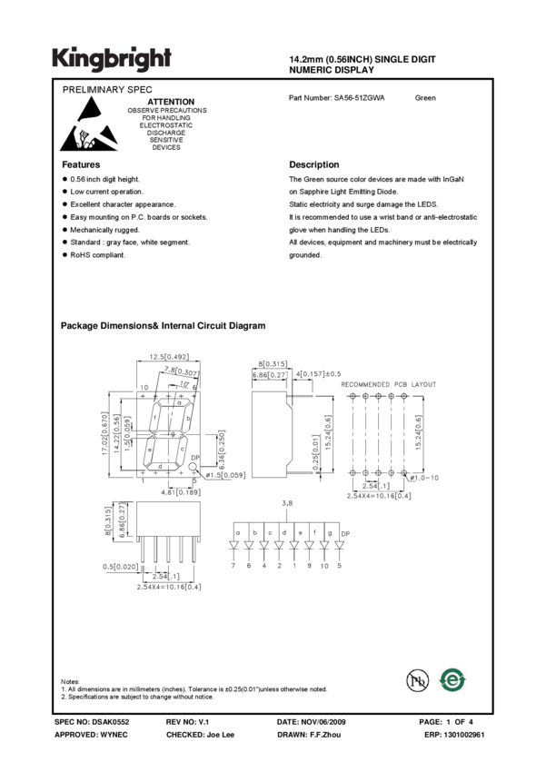 Displays Segmented Panel 1DIGIT 8LED Green 10-Pin