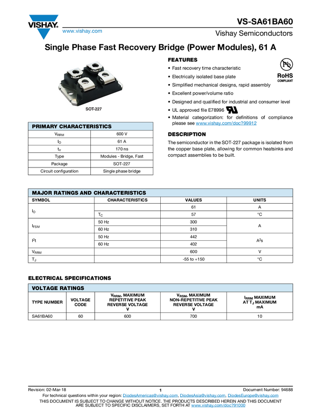 Single Phase Fast Recovery Bridge (Power Modules), 61 A