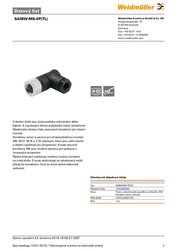 Złącze Weidmüller SAIBW-M8-4P(TL) 1920980000 1 szt.