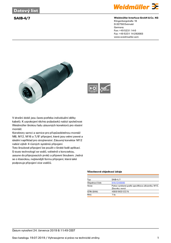 Złącze Weidmüller SAIB-4/7-(KV) 1921080000 1 szt.