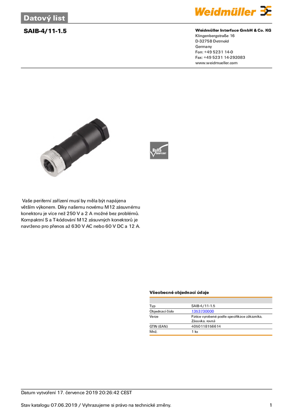 Weidmüller 1353730000 Złącze niekonfekcjonowane czujnika/aktuatora SAIB-4/11-1.5, piny: 4, 1 szt.