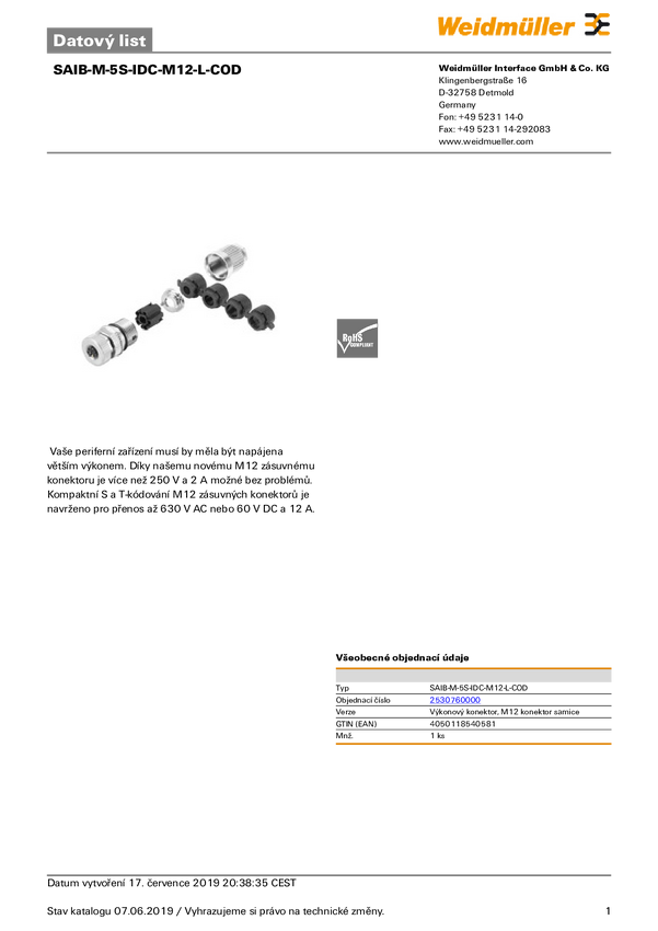 Weidmüller 2530760000 Złącze konfekcjonowane czujnika/aktuatora SAIB-M-5S-IDC-M12-L-COD, 1 szt.