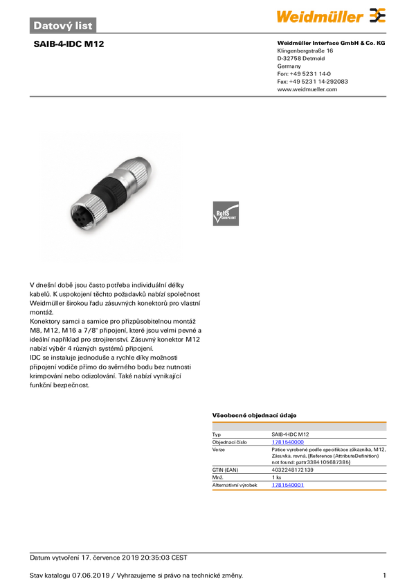 Weidmüller 1781540000 Złącze niekonfekcjonowane czujnika/aktuatora SAIB-4-IDC M12, piny: 4, 1 szt.