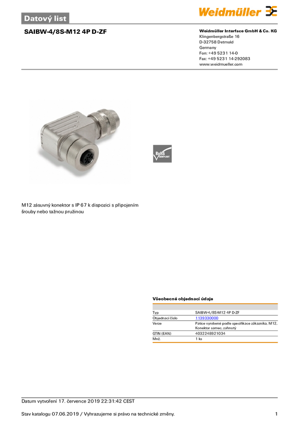Złącze Weidmüller SAIBW-M-4/8 M12 1803910000 1 szt.