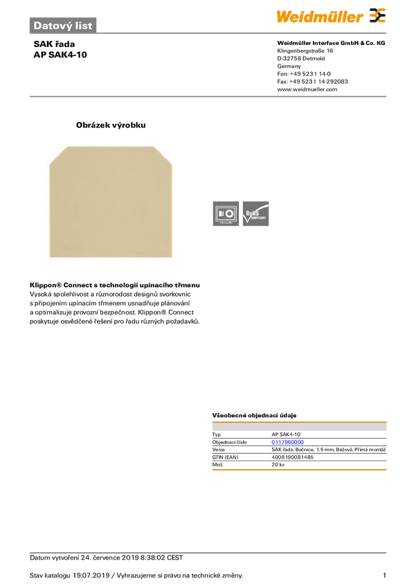 Płyta zamykająca Weidmüller AP SAK4-10 0117960000, 20 szt.