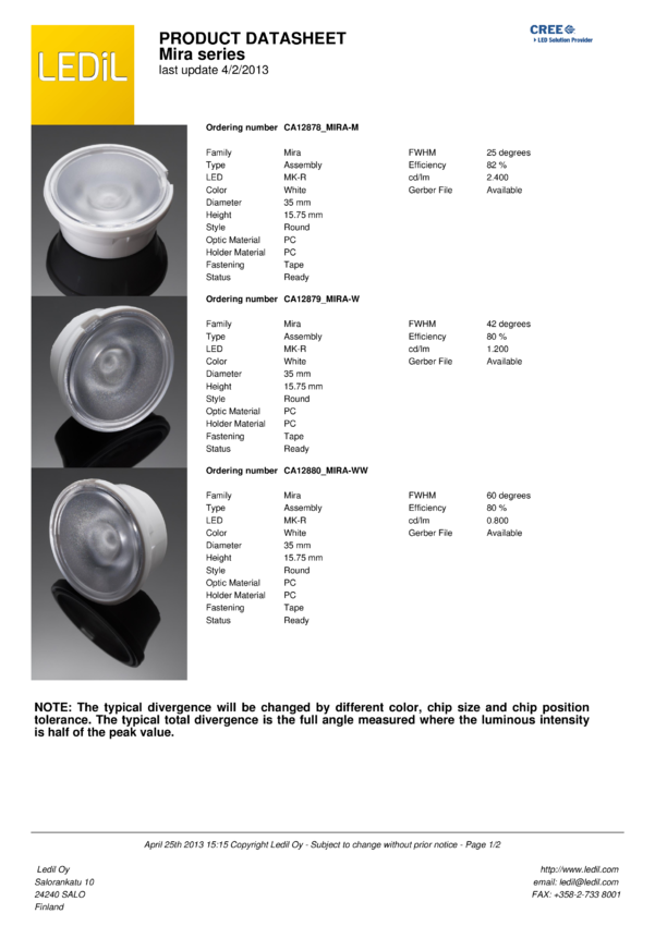 Soczewka MIRA-MKR-W-12879, Wide, 42&deg, do diod LED High Power CREE seria MK-R, średnica 35mm, wysokość 15.8mm, biały holder, taśma samoprzylepna, Ledil