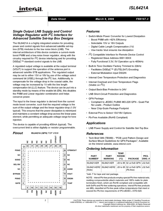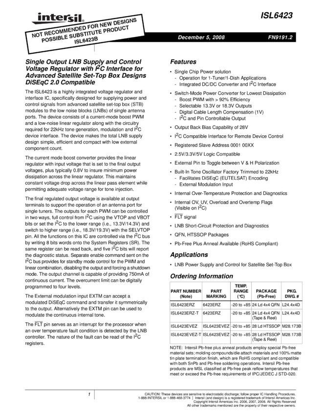 Single Output LNB Supply and Control Voltage Regulator with IC Interface for Advanced Satellite Set-Top Box Designs, DiSEqC 2.0 Compatible