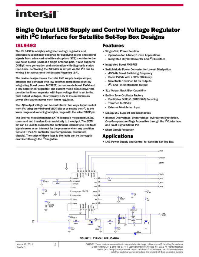 Single Output LNB Supply and Control Voltage Regulator with IC Interface for Advanced Satellite Set-Top Box Designs