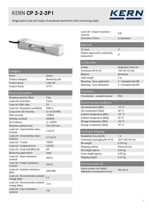 Czujnik tensometryczny CP 3-2-3P1, obciążenie nominalne 3 kg, długość kabla ok. 2 m Sauter CP 3-2-3P1
