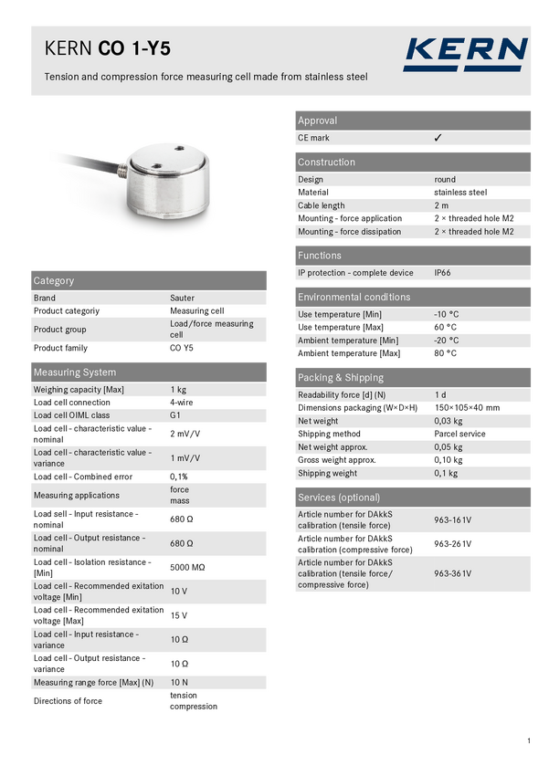 Ogniwo obciążnikowe CO 1-Y5, obciążenie nominalne 1 kg / 10 N Sauter CO 1-Y5