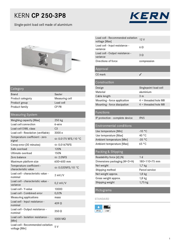 Czujnik tensometryczny CP 250-3P8, obciążenie nominalne 250 kg Sauter CP 250-3P8