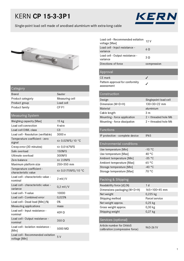 Czujnik tensometryczny CP 15-3-3P1, obciążenie nominalne 15 kg, długość kabla ok. 3 m Sauter CP 15-3-3P1