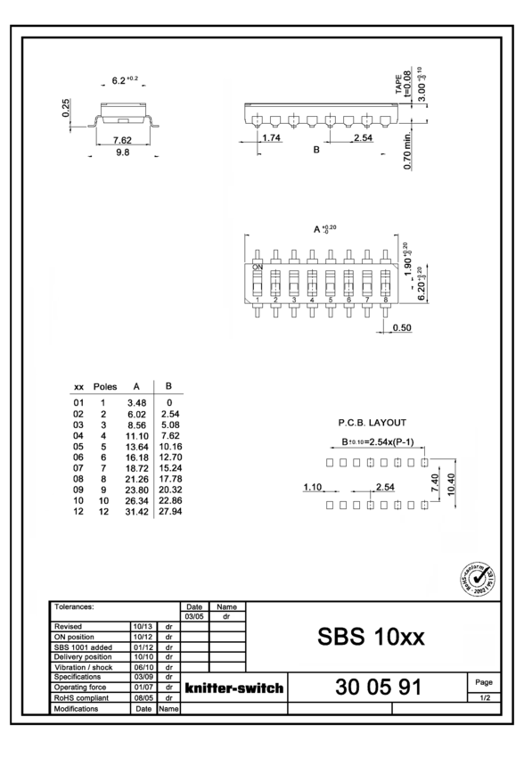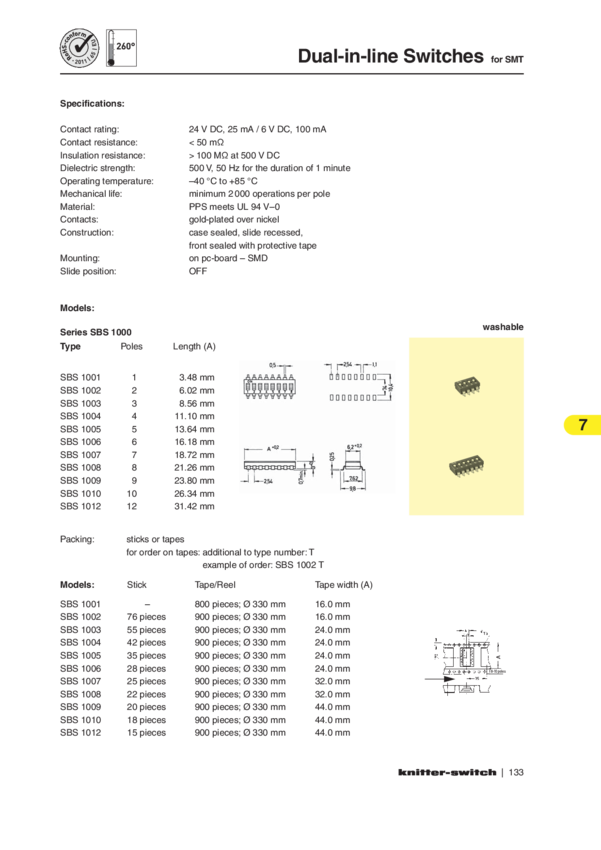 Switch DIP OFF ON SPST 3 Recessed Slide 0.1A 24VDC Gull Wing 2000Cycle/SwitchCycle 2.54mm SMD T/R