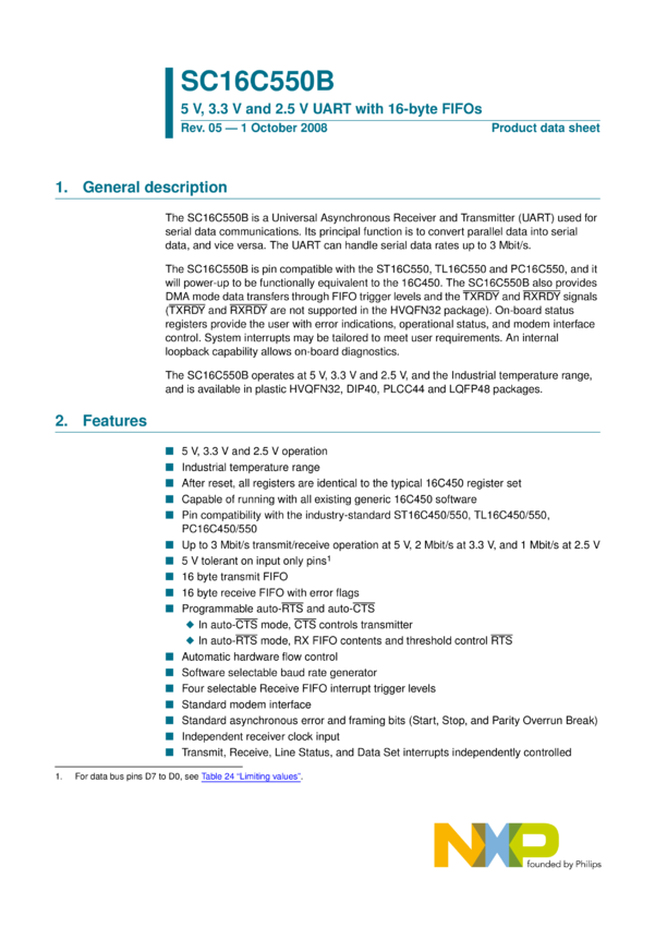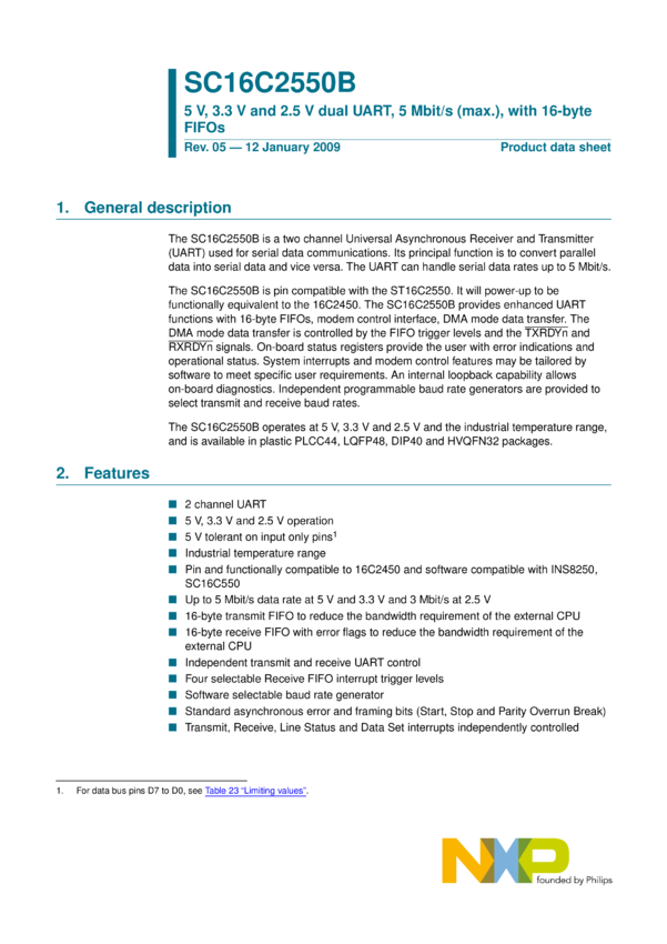 5 V, 3.3 V and 2.5 V dual UART, 5 Mbit/s (max.), with 16-byte FIFOs