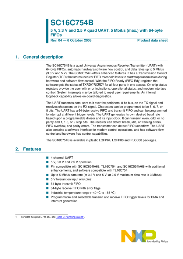 5 V, 3.3 V and 2.5 V quad UART, 5 Mbit/s (max.) with 64-byte FIFOs