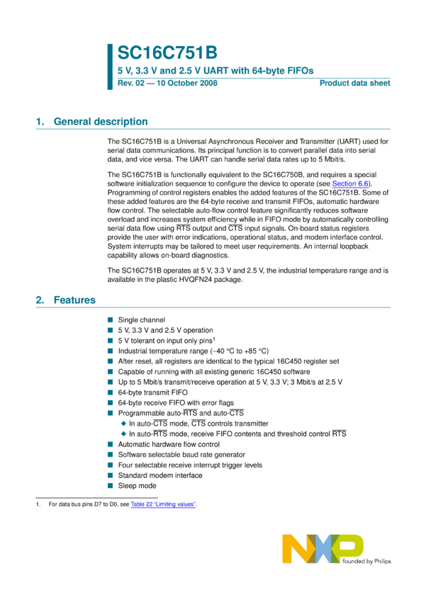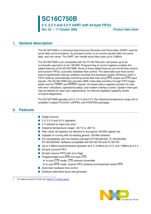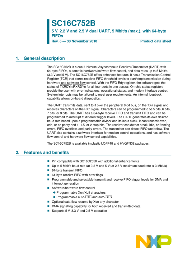 5 V, 2.2 V and 2.5 V dual UART, 5 Mbit/s (max.), with 64-byte FIFOs
