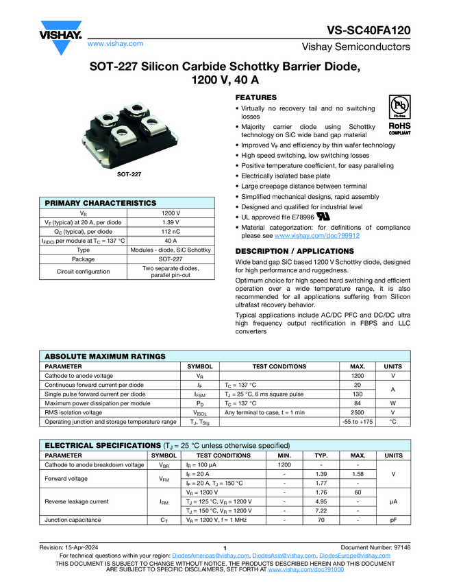 SOT-227 Silicon Carbide Schottky Barrier Diode, 1200 V, 40 A