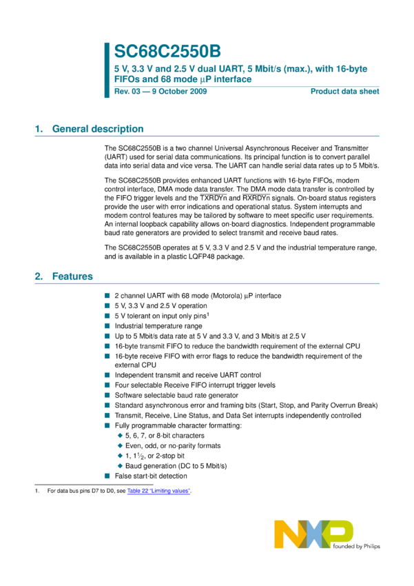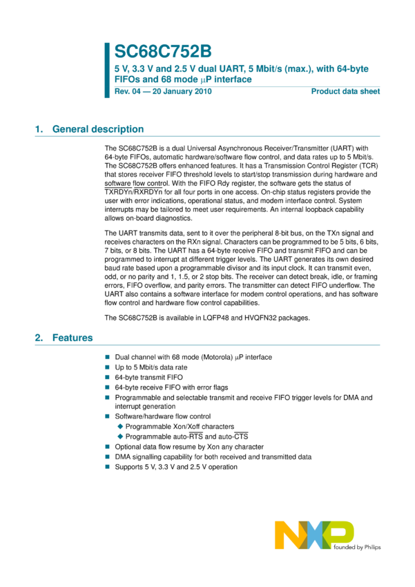 5 V, 3.3 V and 2.5 V dual UART, 5 Mbit/s (max.), with 64-byte FIFOs and 68 mode uP interfac