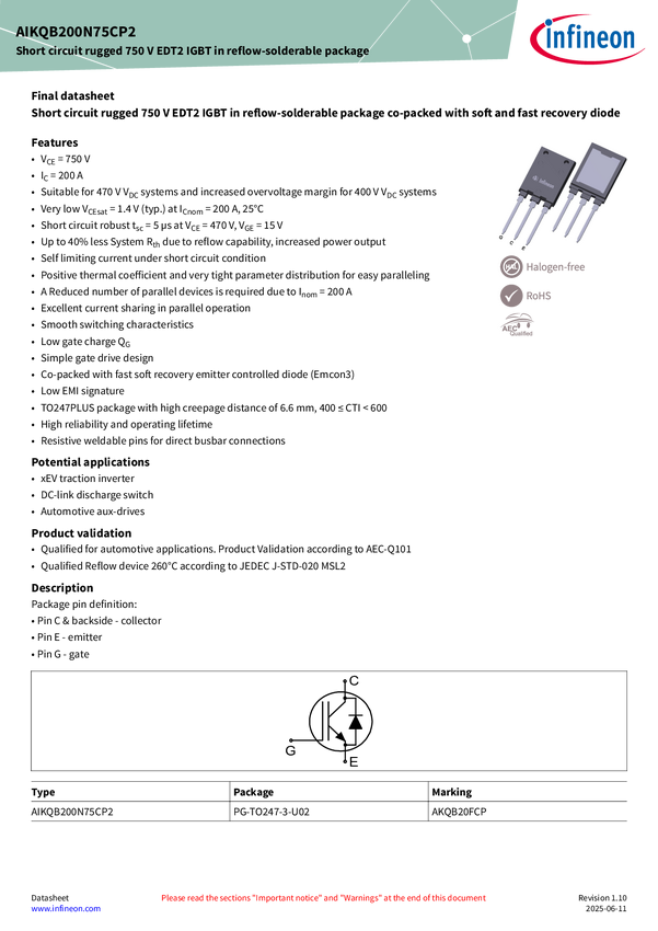 750 V, 200A EDT2 IGBT with anti-parallel diode in reflow-solderable package TO247PLUS 3-Pin The AIKQB200N75CP2 discrete IGBT in a 3-Pin TO247PLUS package with 750V EDT2 technology, ideal for high voltage automotive applications supporting up to 470V battery voltages. It enables easy paralleling, system flexibility and power scalability. Upgrading existing designs with AIKQ200N75CP2 by using reflow soldering assembly enhances system performance with up to 40% better thermal conductivity.