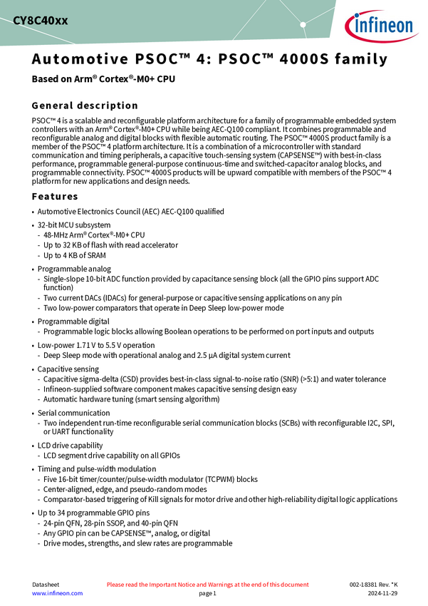 PSOC™ 4 is a scalable and reconfigurable platform architecture for a family of programmable embedded system controllers Automotive PSOC™ 4100S Plus extends the PSOC™ 4 S Series and is a combination of a microcontroller with standard communication and timing peripherals, a capacitive touch-sensing system (CAPSENSE™) with best-in-class performance, programmable general-purpose continuous-time and switched-capacitor analog blocks, and programmable connectivity.