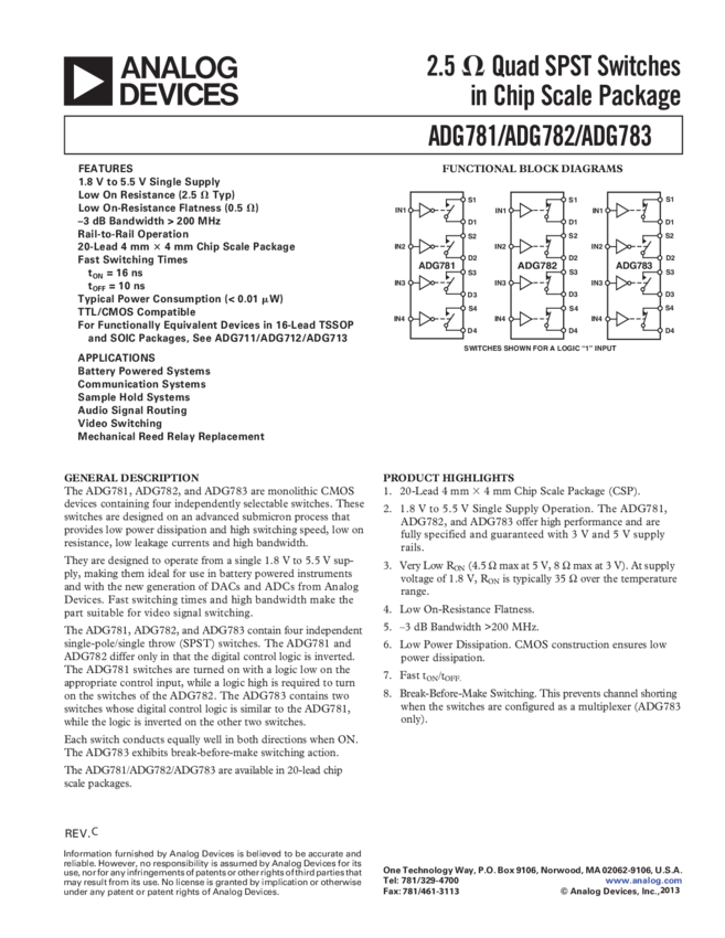 ADG783: CMOS, Low Voltage 2.5 Ohm Quad SPST Switches in Chip Scale Package