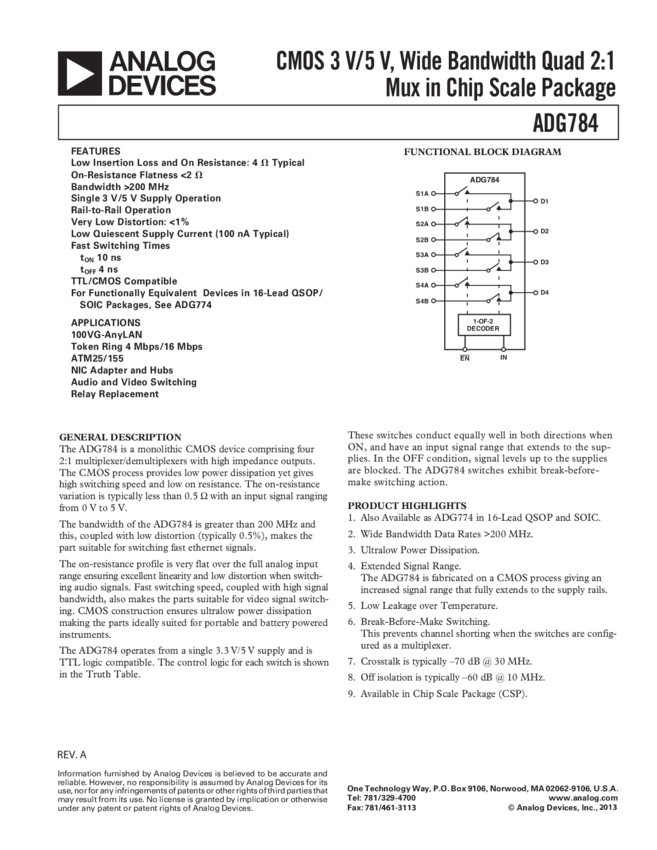 ADG784: CMOS 3V/5 V, Wide Bandwidth Quad 2:1 Mux in Chip Scale