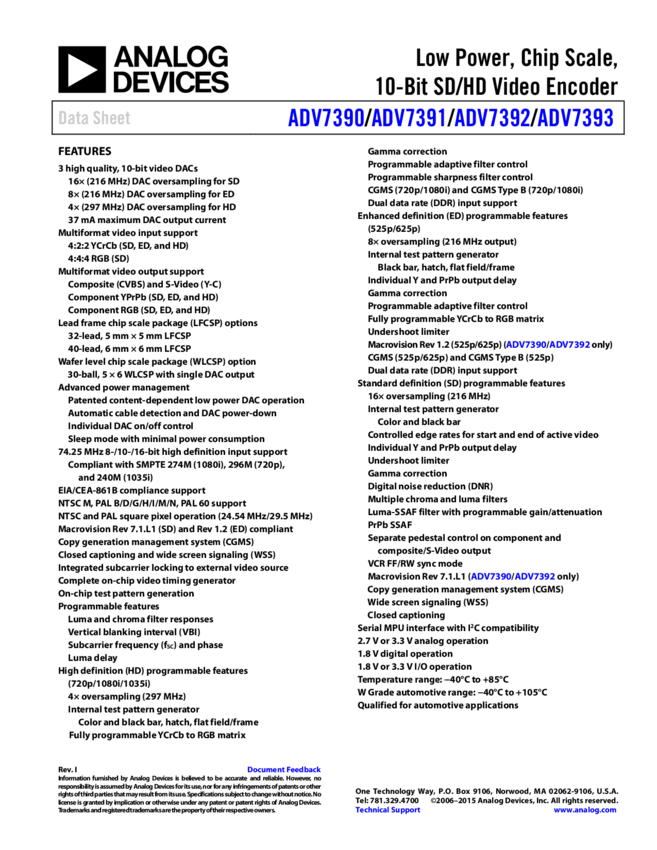 ADV7393: Low Power, Chip Scale 10-Bit SD/HD Video Encoder