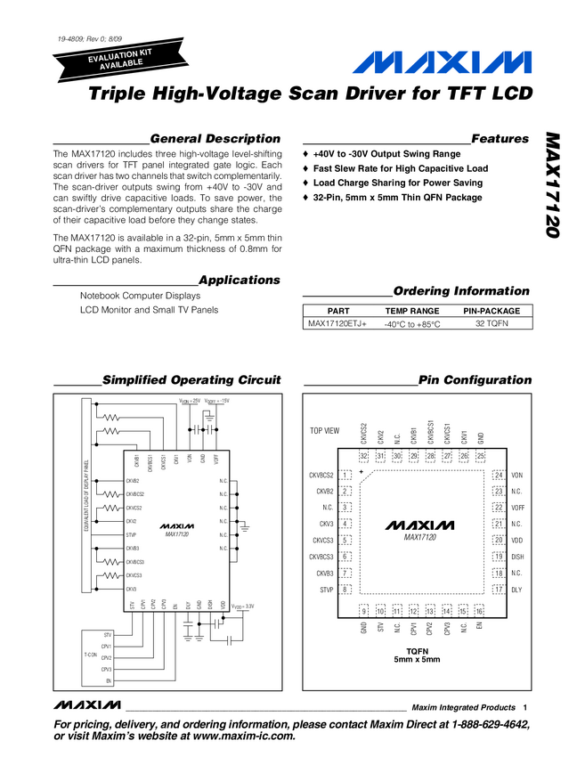 10-Channel High-Voltage Scan Driver and VCOM Amplifier for TFT LCD Panels
