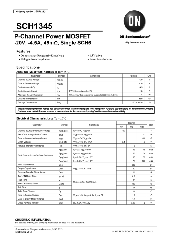 Power MOSFET, -20V, 49mΩ, -4.5A, Single P-Channel