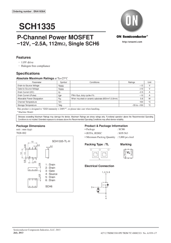 P-Channel Power MOSFET, -12V, -2.5A, 112mΩ, Single SCH6