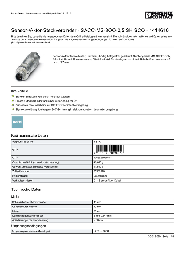 Phoenix Contact 1414610 Złącze czujnika/aktuatora SACC-MS-8QO-0,5 SH SCO, piny: 8, 1 szt.