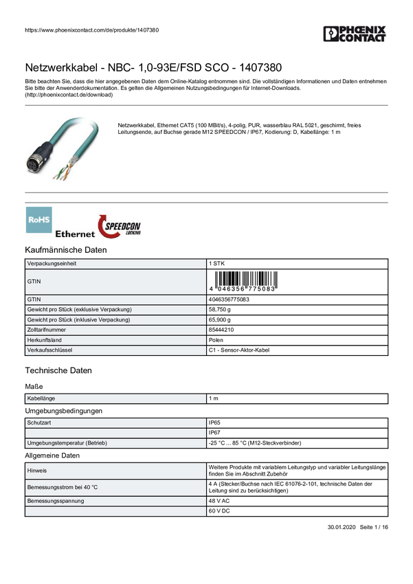 Phoenix Contact 1407380 Złącze czujnika/aktuatora NBC- 1,0-93E/FSD SCO, piny: 4, 1.00 m, 1 szt.