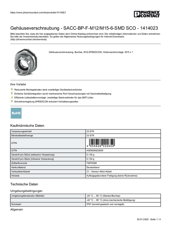 Phoenix Contact 1414023 Kołnierz montażowy SACC-BP-F-M12/M15-6-SMD SCO, 20 szt.