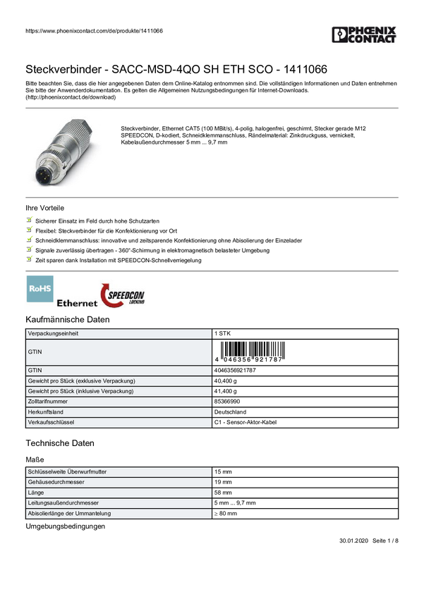 Phoenix Contact 1411066 Złącze czujnika/aktuatora SACC-MSD-4QO SH ETH SCO, piny: 4, 1 szt.