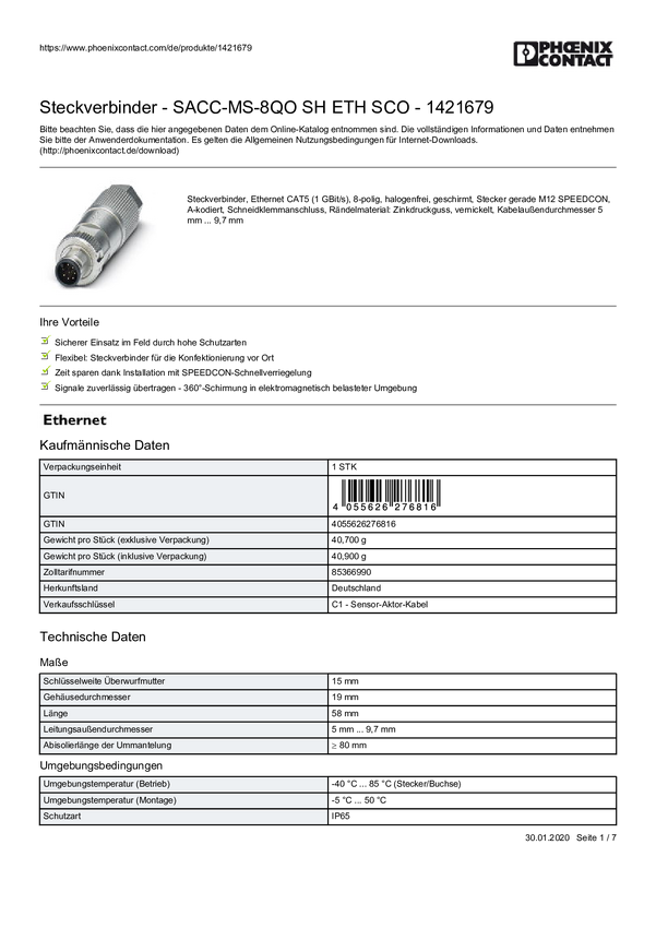 Phoenix Contact 1421679 Złącze czujnika/aktuatora SACC-MS-8QO SH ETH SCO, piny: 8, 1 szt.