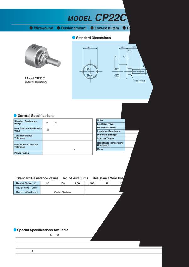 Potencjometr drutowy na bazie korpusu CP22E markowany SCP22E tol.3% lin 1%; średnica 22mm; gł.12mm ośka 6mm;dł.22 mm; gwint M9 P=0,75; wypr.z boku; kąt mechaniczny 360 st; kąt elektryczny 220 st(110+110) CT-Center tap Electrical rotating angle = 200 degrees and Center Tap (no dead band ) Voltage Center Tap