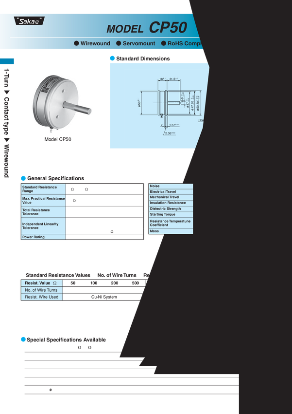 Potenjometr drutowy; Servo; tolerancja +-3% liniowość +-0,5% 1,5W; 1 obrotowy; 2 potencjometry na 1 osi średnica 50,8 mm; głębokość: 2x ośka 6,00 mm x 31,5 mm; od frontu 3 x M3 na okręgu o fi. 30 mm Kąt pracy mechaniczny 360 stopni; kąt pracy elektryczny 355 stopni Uwaga: zdjęcie podobnego