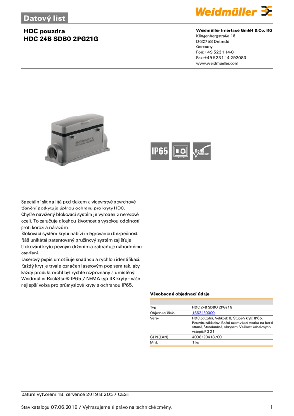 Weidmüller HDC 24B SDBO 2PG21G 1662180000 Obudowa podstawowa 1 szt.