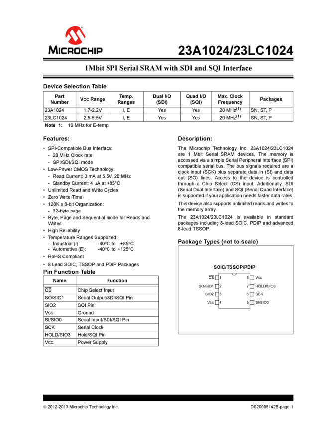 23A1024/23LC1024 1Mbit SPI Serial SRAM with SDI and SQI Interface (11/06/2013)