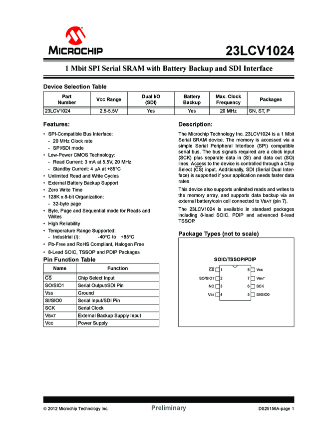 23LCV1024 1Mbit SPI Serial SRAM with Battery Backup and SDI Interface (09/28/2012)
