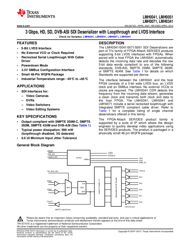 HD/SD SDI Reclocker 48-Pin LLP EP T/R
