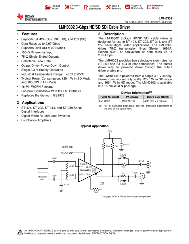 HD/SD SDI Cable Driver 16-Pin LLP EP T/R