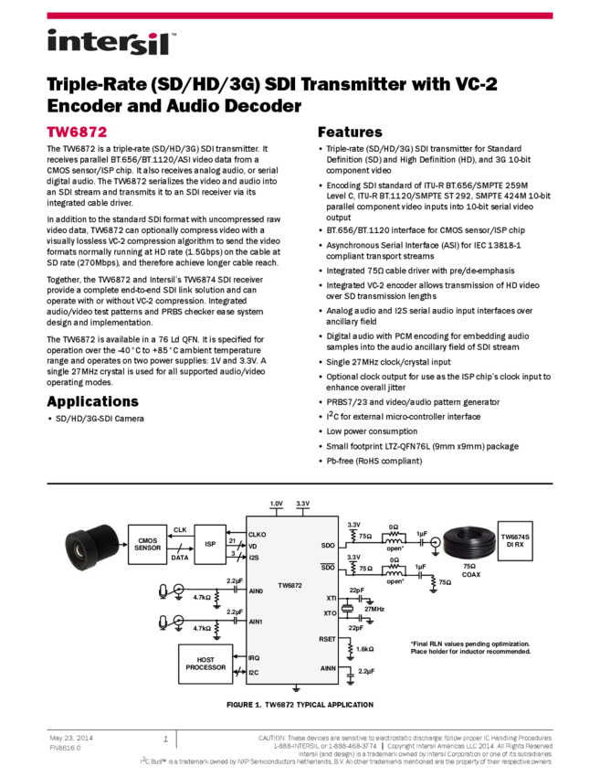 Triple-Rate (SD/HD/3G) SDI Transmitter with VC-2 Encoder and Audio Decoder