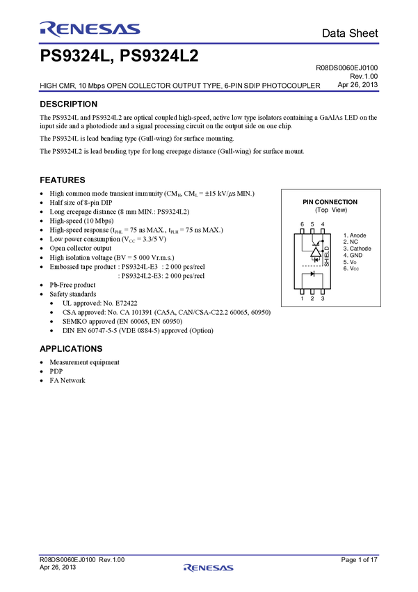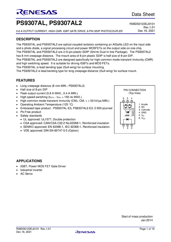 1 Mbps Totem Pole Output Type High CMR, IPM DRIVER 6-PIN SDIP Photocoupler