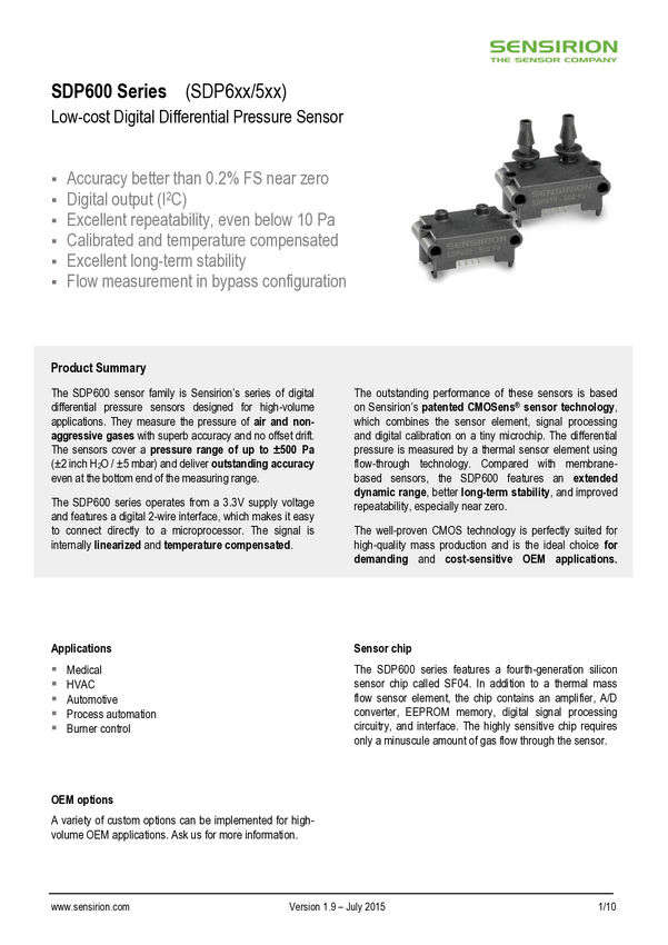 SDP33 - Digital differential pressure sensor (±1500 Pa)