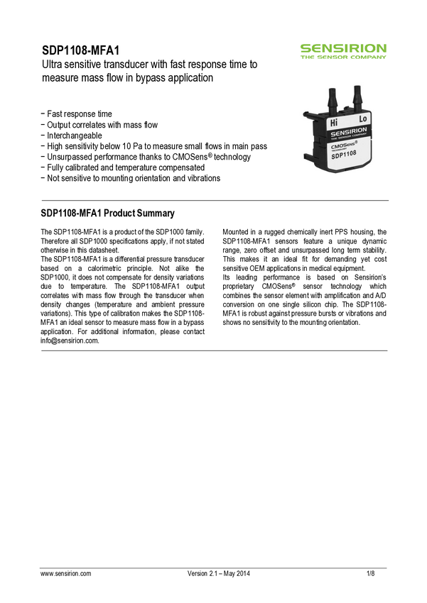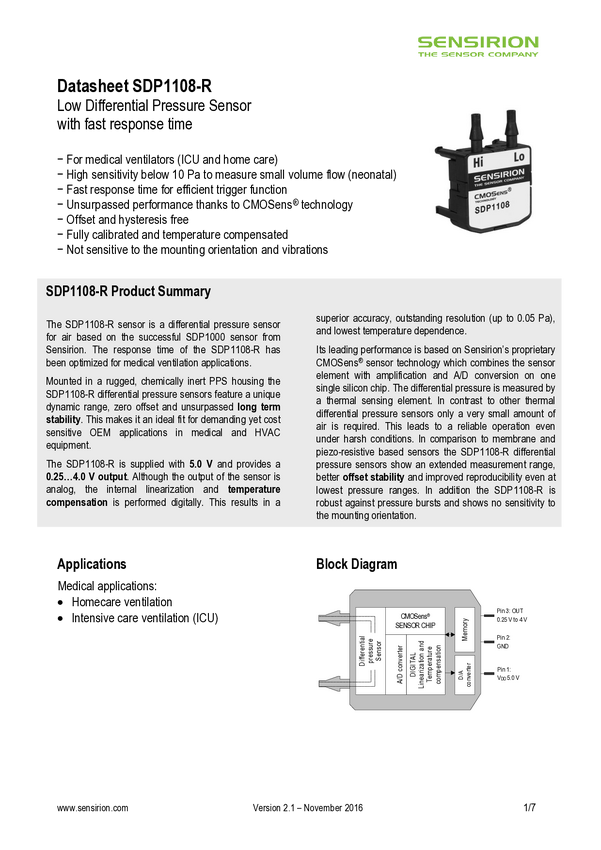 SDP1108-MFA - Analog differential pressure sensor for mass flow (±500 Pa)